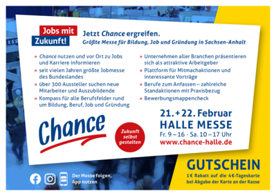 Liebe Messebesucher, nutzen Sie unseren nebenstehenden Besuchergutschein zur Chance 2025 vom 21. bis 22. Februar.